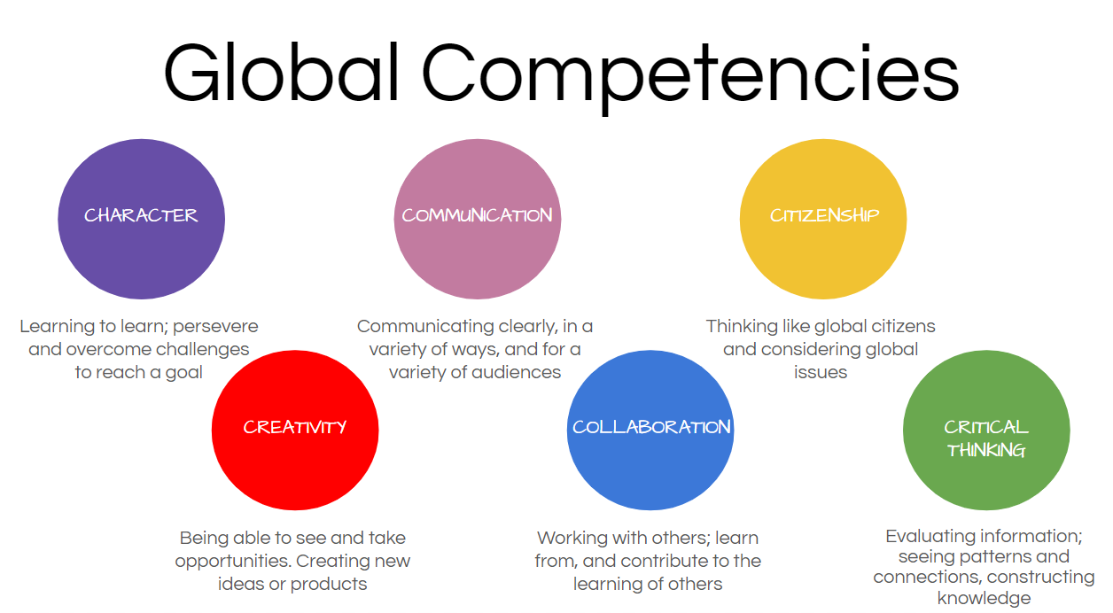 Our pedagogical focus extends beyond technical proficiency to the holistic development of the learner. By integrating technology into our blended learning environments, we actively cultivate the Global Competencies illustrated below. Whether students are collaborating on shared digital platforms or critically evaluating online information, they are building the Character and Citizenship necessary to navigate a complex world. This approach ensures our students are not only digitally literate but are empowered to apply these competencies as compassionate, creative, and responsible members of our global community.